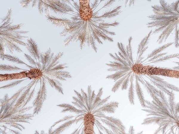 Tropikalne palmy sfotografowane od dołu. Połącz tę fototapetę w swoim domu, aby uzyskać jeszcze większą atmosferę.
