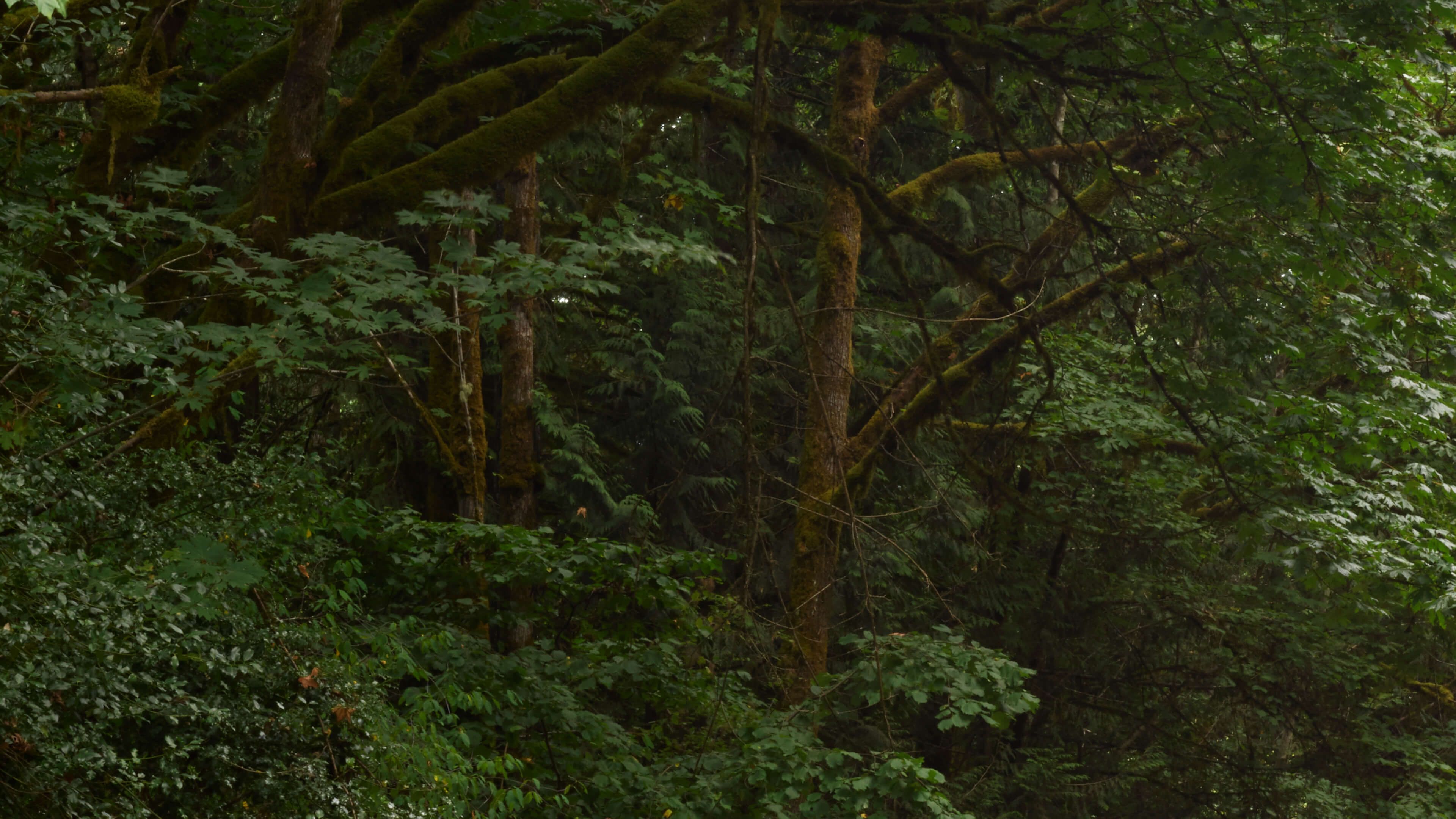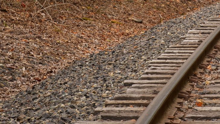 Stara linia kolejowa, która skręca w lewo przez las.