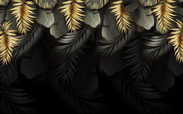Liście na ciemnym tle łączą tę fototapetę na przykład w sypialni.