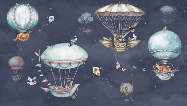 Zwierzęta unoszą się przez głębokie nocne niebo w fantazyjnych balonach, otoczone gwiazdami, latawcami i ptakami. Magiczna i uspokajająca scena w bogatych odcieniach niebieskiego i delikatnych akcentach.