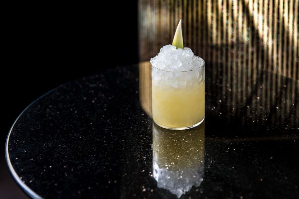 Luksusowy napój z dużą ilością lodu na czarnym stole.