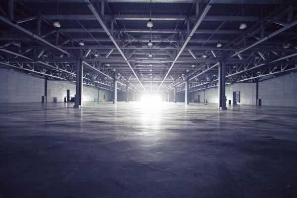 Fototapeta z ciemnym magazynem i podświetlonym otworem na końcu.