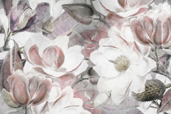 Un delicado despliegue de magnolias con grandes y exuberantes pétalos en tonos suaves. El sutil estilo acuarela aporta un aspecto elegante y atemporal, perfecto para crear una atmósfera relajante.