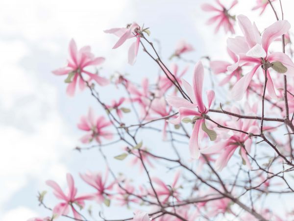 Piękne różowe kwiaty magnolii w piękny wiosenny dzień. Ta fototapeta nada Twojemu domowi jeszcze więcej atmosfery.