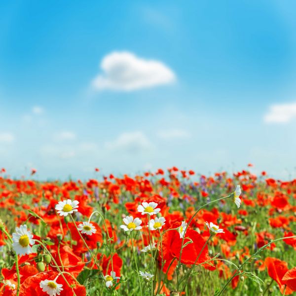 Piękne pole pełne czerwonych maków i białych stokrotek z czystym, błękitnym niebem w tle.