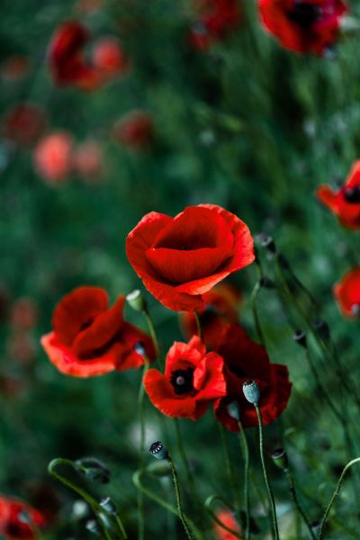 Szczegółowy obraz z czerwonych maków na tle zielonej trawy.