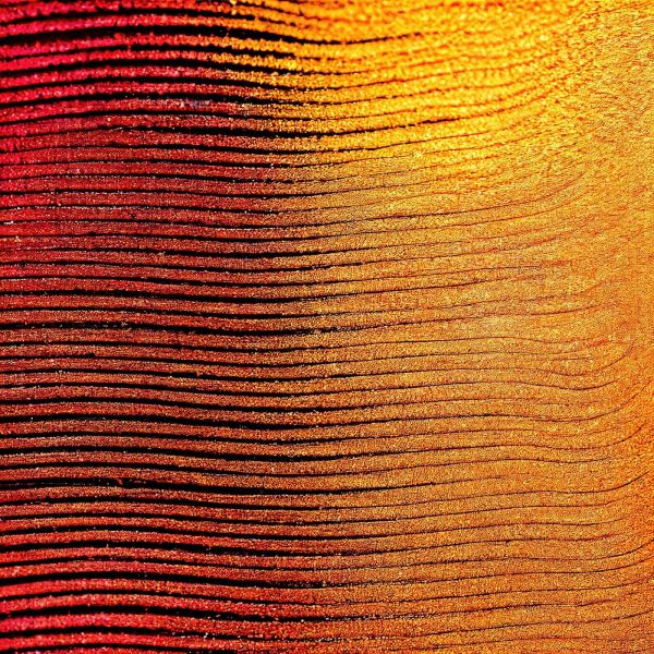 To potężne wzornictwo ożywia abstrakcyjną grę linii i gradientów kolorystycznych, gdzie ciepło i rytm są kluczowe. Falujące, poziome linie poruszają się po powierzchni jak warstwy ziemi, ciepła lub stopionego metalu. Gradient kolorystyczny przechodzi od głębokiej rubinowej czerwieni i rdzawego pomarańczu do błyszczącego złota, co nadaje całości dynamiczny, niemalże świecący efekt. Tekstura jest drobnoziarnista i błyszcząca, z odczuwalną energią, która wypełnia przestrzeń.