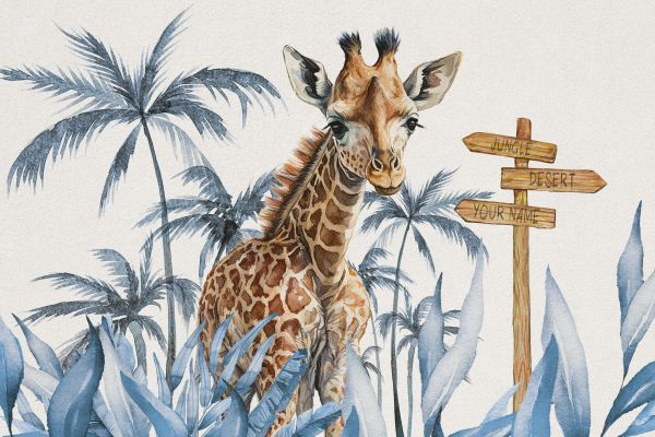 Mała żyrafa wśród wysokich niebieskich drzew dżungli. Dostępna również z imieniem dziecka!