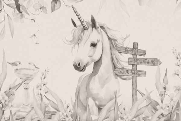 W zaczarowanym ogrodzie pełnym kwitnących kwiatów i trzepoczących ptaków, wdzięczny jednorożec stoi jako strażnik naturalnego piękna. Senny wygląd i miękkość otoczenia zostały uchwycone w delikatnej palecie odcieni szarości, przywołując mistyczną atmosferę.