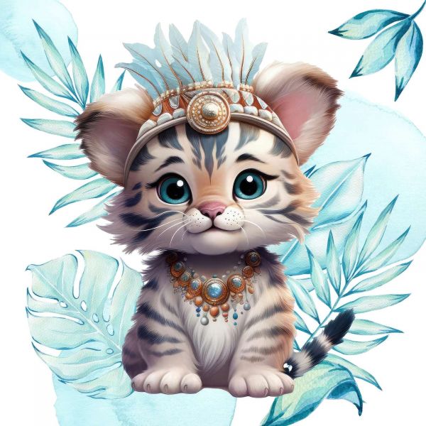 Piękna tapeta z małym tygryskiem na tle turkusowo-niebieskich liści.