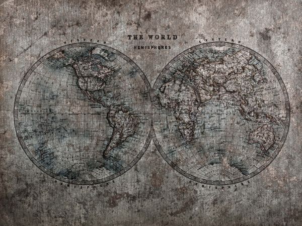 Mapa świata z odcieniami szarości na fototapecie. Odcienie szarości nadają tej tapecie industrialny wygląd.