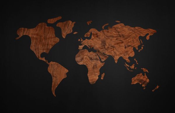 Piękna mapa świata wykonana z forniru drewnianego. Czarne tło sprawia, że mapa świata pięknie się wyróżnia.