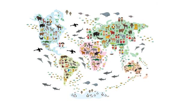 Mapa świata w różnych kolorach z różnymi zwierzętami na każdym z kontynentów.