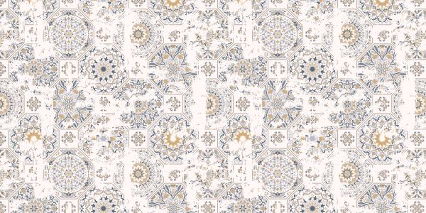 Ta elegancka kompozycja sześciokątnych płytek jest usiana symetrycznymi, inspirowanymi Marokiem wzorami, zanurzonymi w delikatnej palecie kolorów ochry, szarości i kości słoniowej.