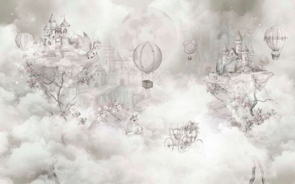 Baśniowa scena w miękkich odcieniach srebra i szarości, z latającymi smokami, zamkami marzeń i balonami powietrznymi między unoszącymi się chmurami. Jednorożec, kwiaty i elegancka kareta dopełniają obraz i czynią go czarującym.