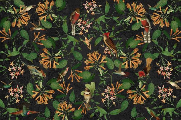 Bogata kompozycja tropikalnych kolibrów i kolorowych kwiatów na głębokim, ciemnym tle. Zielone liście i złote akcenty kwiatów tworzą elegancki i egzotyczny kontrast, idealny do dodania odrobiny luksusu do każdej przestrzeni.
