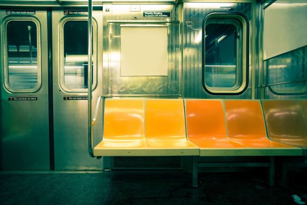 Żółte siedzenia w środku pociągu w Nowym Jorku.