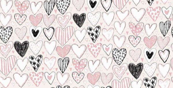 Ten uroczy wzór łączy w sobie figlarną spontaniczność z delikatnym, romantycznym wyglądem. Ręcznie rysowane serca różnią się stylem i fakturą: niektóre są wypełnione czarnym tuszem, inne pasteloworóżowymi odcieniami, a niektóre pozostają elegancko białe. Wzory wewnątrz – od kropek, pasków i kwiatków po ołówkowe bazgroły – nadają całości figlarnego, niemal dziecięcego uroku, nie popadając w infantylność. Tło ma jasnoróżowy odcień subtelnie ozdobiony małymi, rytmicznie rozmieszczonymi serduszkami, co sprawia, że projekt wydaje się lekki i radosny.