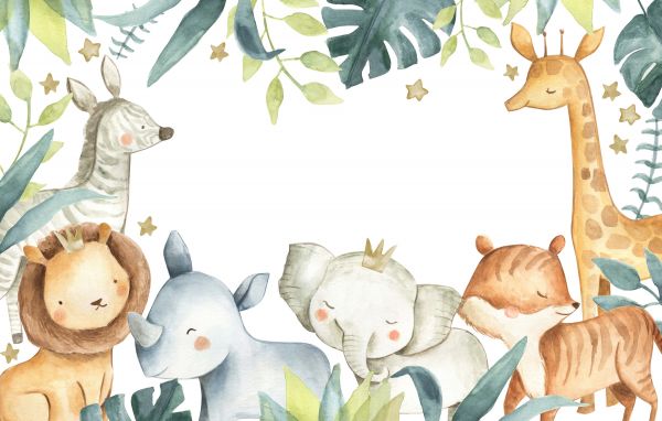Mieszanka zwierząt w dżungli. Zwierzęta na tej tapecie wyglądają na szczęśliwe. Idealna fototapeta do pokoju dziecięcego.
