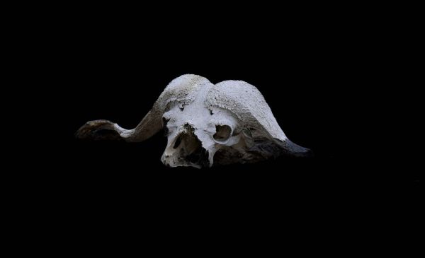 Ta imponująca kompozycja przedstawia zwietrzałą czaszkę bawoła z elegancko wygiętymi rogami, ostro podkreśloną na głębokoczarnym tle. Jasna, porowata struktura kości intensywnie kontrastuje z ciemnością, dzięki czemu widoczny jest każdy detal zużycia i faktury. Obraz emanuje spokojem, siłą i nutą tajemniczości.