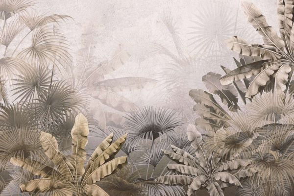 To wyrafinowany botaniczny wzór ukazuje serene piękno tropikalnego krajobrazu z delikatnym, mglistym wyglądem. Warstwowe palmy i liście bananowca w ciepłych odcieniach ziemi tworzą subtelny, naturalny kontrast w stosunku do jasnego, teksturowanego tła. Połączenie zatartego konturu i szczegółowych liści tworzy głębię i uspokajający efekt wizualny, idealny do ponadczasowego i stylowego wnętrza.