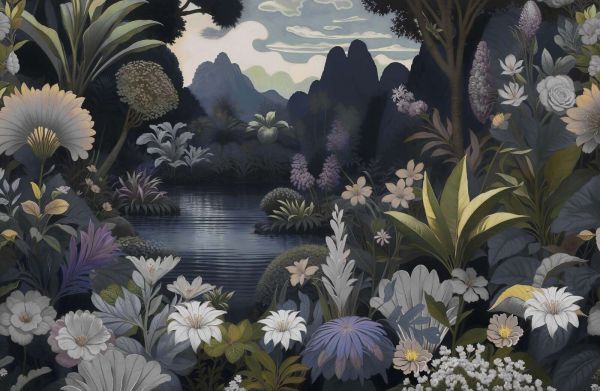 Marzycielski górski krajobraz z spokojnym jeziorem, otoczony bujnymi kwiatami i tropikalnymi liśćmi. Głębokie nocno-niebieskie odcienie łagodzone są przez akcenty w kremowym, liliowym i delikatnozielonym kolorze, co tworzy spokojną i tajemniczą atmosferę.