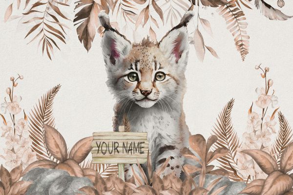 Na tym obrazie uwagę przyciąga uroczy ryś z czujnymi, ciekawskimi oczami i charakterystycznymi kępkami na uszach. Otoczony miękkim łóżkiem z kwiatów i natury w kolorze taupe, ryś emanuje dziką elegancją.