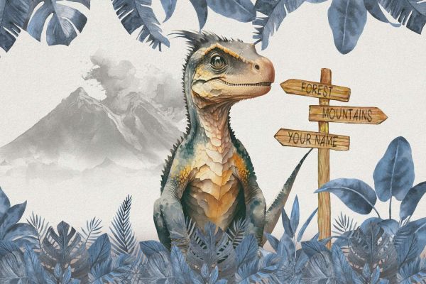 Dinozaur velociraptor w niebieskiej dżungli. Dostępny również z imieniem Twojego dziecka!
