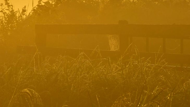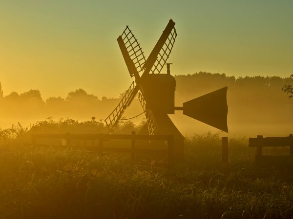 Piękny młynek łąkowy o wschodzie słońca z detalami żagli i niską wiszącą mgłą w tle.