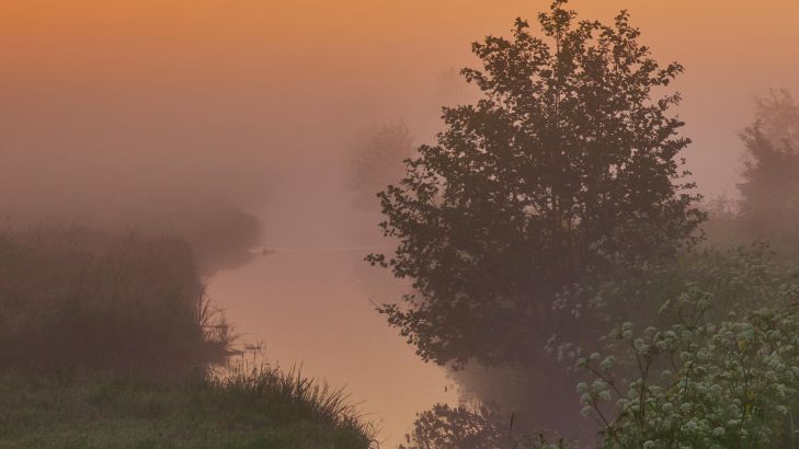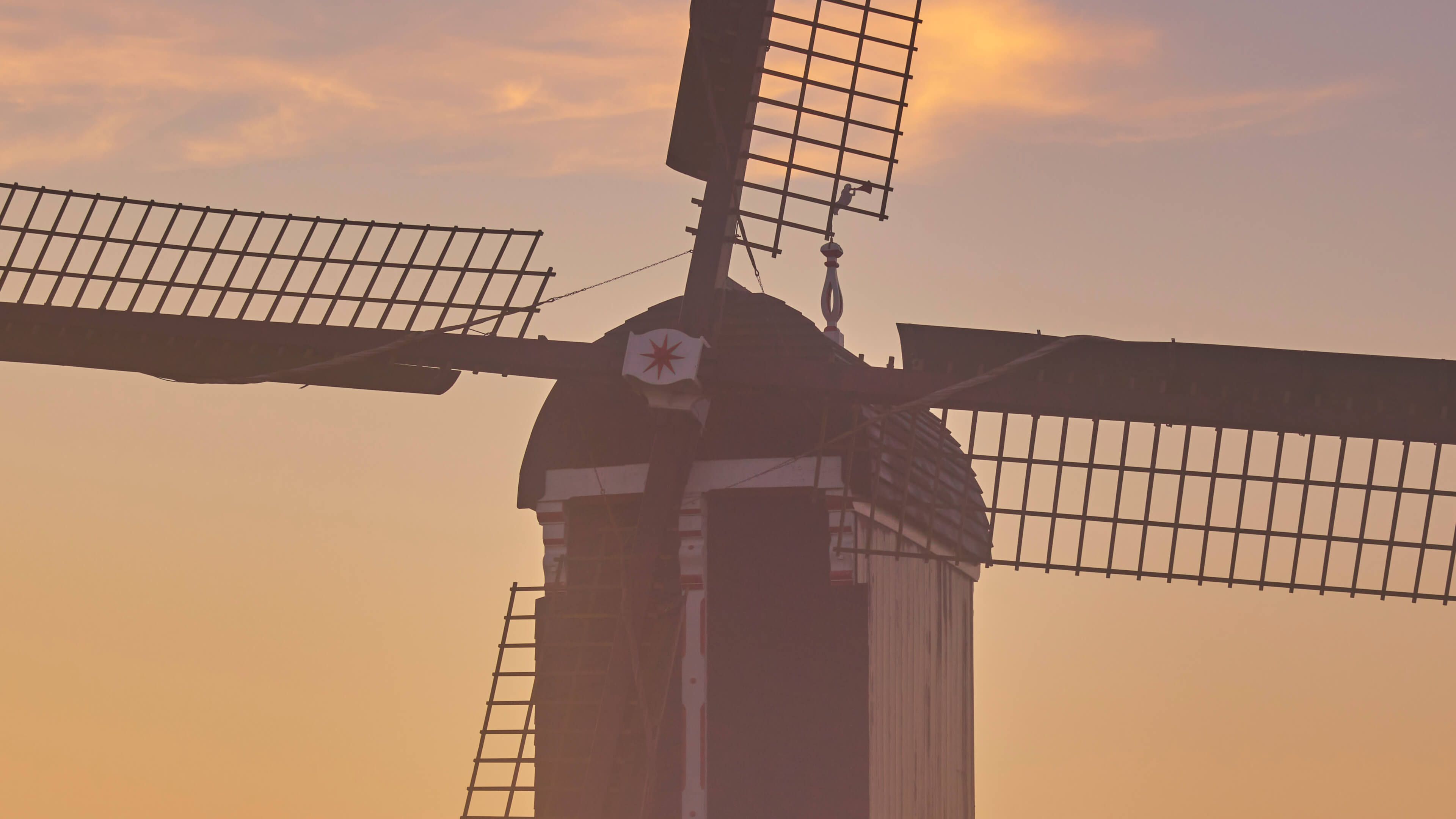 Młyn przy kolorowym wschodzie słońca. Wschód słońca pięknie zabarwił niebo pomarańczową poświatą.