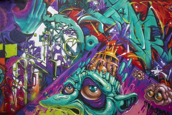 Kolorowa tapeta wypełniona nowoczesnym graffiti.