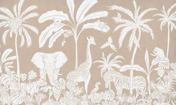 Egzotyczny krajobraz pełen dzikich zwierząt, takich jak słonie, żyrafy, zebry i małpy, otoczony bujnymi tropikalnymi roślinami. Delikatny kolor w tle i ilustracje nadają całości spokojny wygląd.