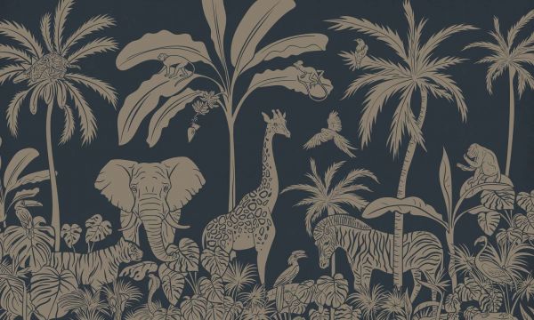 Egzotyczny krajobraz pełen dzikich zwierząt, takich jak słonie, żyrafy, zebry i małpy, otoczony bujnymi tropikalnymi roślinami. Delikatne różowe tło i ilustracje nadają całości vintage'owy i spokojny charakter.