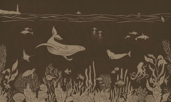 Serenowy podwodny krajobraz z wielorybami, płaszczkami i innymi morskimi stworzeniami w delikatnych odcieniach. Projekt uchwyca spokój oceanu z minimalistycznymi detalami, subtelnymi koralami i cieniami, które tworzą wyrafinowaną atmosferę.