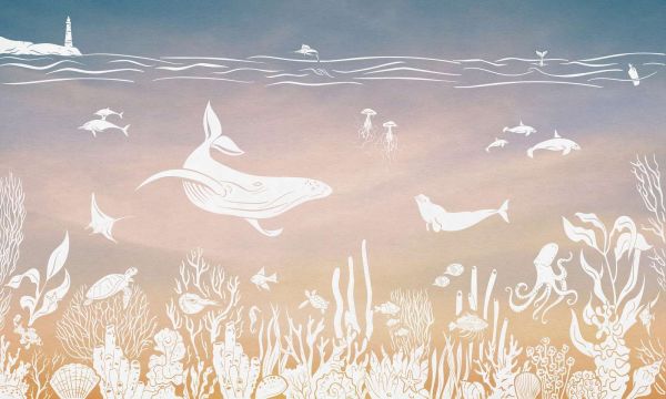 Serenowy podwodny krajobraz z wielorybami, płaszczkami i innymi morskimi stworzeniami w delikatnych odcieniach. Projekt uchwyca spokój oceanu z minimalistycznymi detalami, subtelnymi koralami i cieniami, które tworzą wyrafinowaną atmosferę.