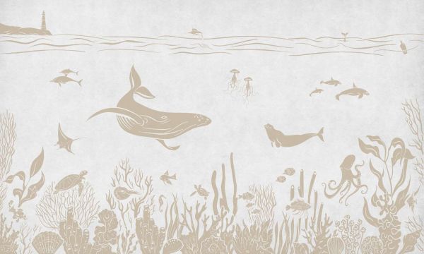 Sielankowy podwodny krajobraz z wielorybami, płaszczkami i innymi morskimi stworzeniami w delikatnych odcieniach. Projekt uchwyca spokój oceanu z minimalistycznymi detalami, subtelnymi koralami i cieniami, które tworzą wyrafinowaną atmosferę.