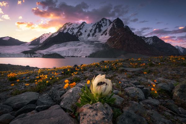 Poranek w Saussurea na fototapecie. Ośnieżona góra nad jeziorem z kwiatami i pięknym niebem.