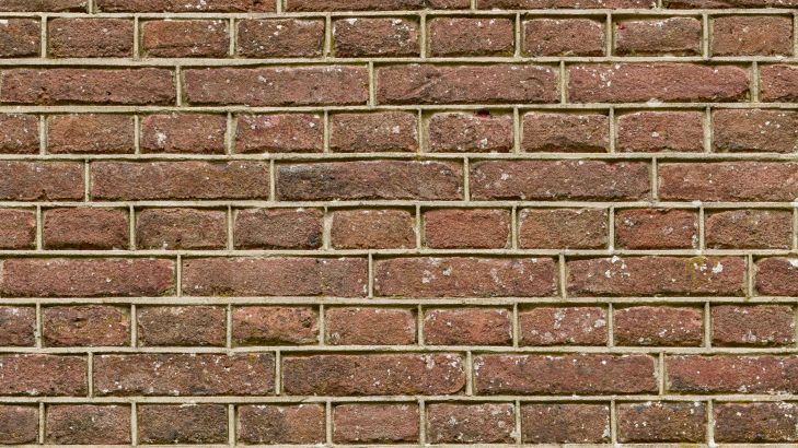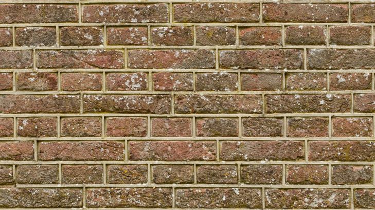 Mur z starych cegieł z ciasnym spoinowaniem. Spód ściany jest zabarwiony na zielono przez mech.