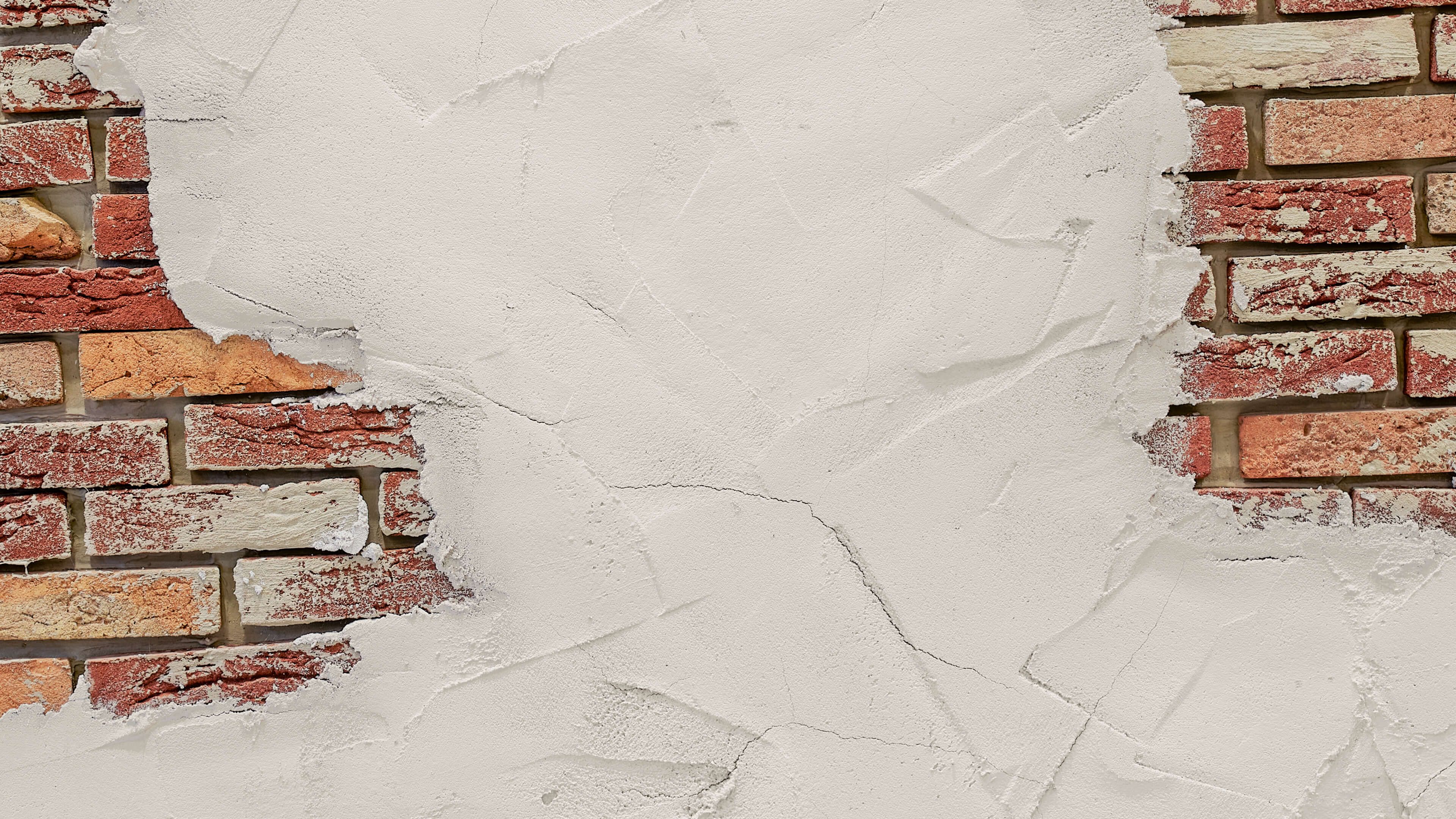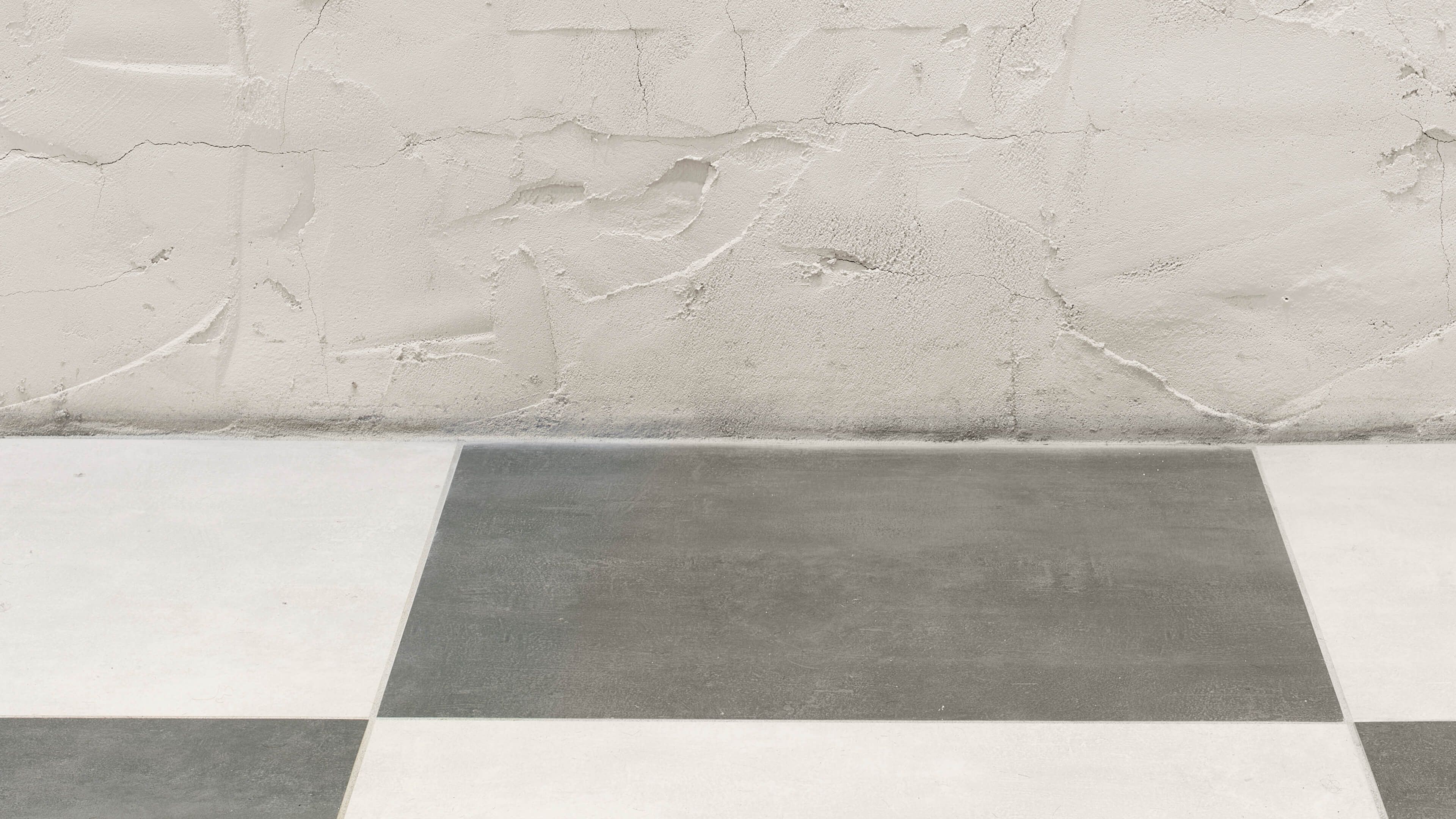 Ściana z cegieł i piękna sztukateria na szachownicowej podłodze.