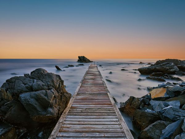 Jetty na skalistym brzegu przy pięknym zachodzie słońca. Z tą fototapetą to tak jakbyśmy stali na molo.