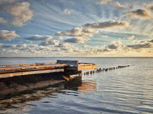 Jetty z pięknymi chmurami o wschodzie słońca. Połącz tę fototapetę na przykład w salonie.