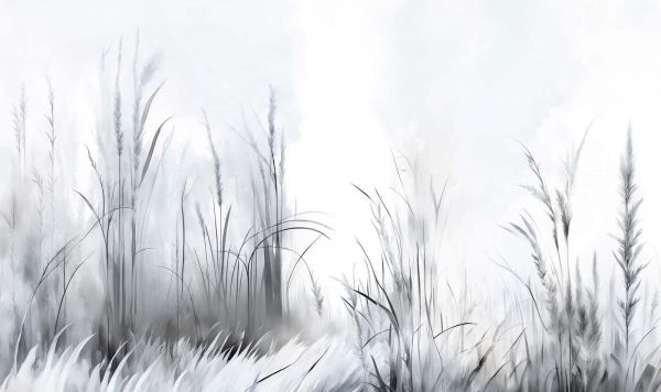 Falujące trawy w delikatnych odcieniach niebieskiego tańczą na wietrze na jasnym tle. Wyrafinowana technika akwarelowania i subtelne pociągnięcia pędzla nadają projektowi świeży i uspokajający wygląd, idealny do spokojnego i stylowego otoczenia.