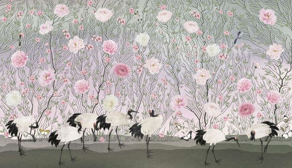 Una escena elegante con majestuosas grullas rodeadas de delicadas rosas y flores. Los sutiles tonos de rosa y verde crean una atmósfera serena y refinada, realzada por los elegantes detalles de flores y hojas. Las mariposas y libélulas añaden un toque de elegancia al diseño.