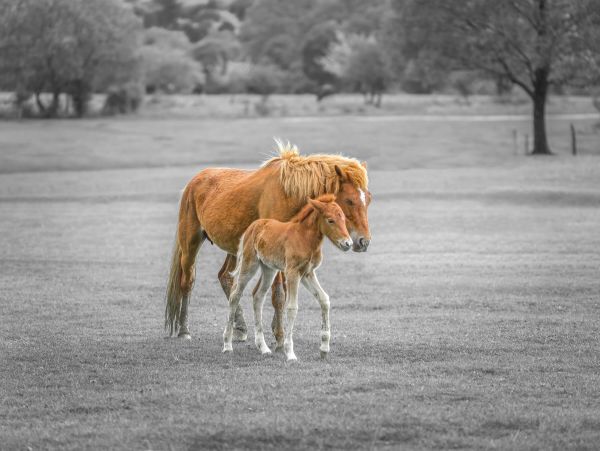 Kucyk z New Forest spacerujący po łące ze swoim źrebakiem. Kucyk i źrebak są pokazane w kolorze, tło jest czarno-białe.