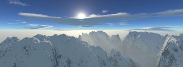Śnieżne szczyty górskie z jasnoniebieskim niebem i panoramą.