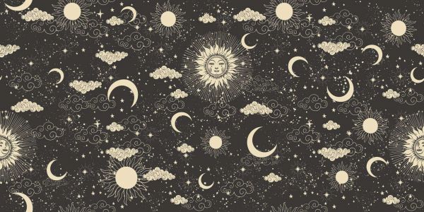 Urzekająca nocna scena z wdzięcznymi słońcami, księżycami, gwiazdami i chmurami w klasycznym stylu na głębokim czarnym tle. Projekt emanuje mistycyzmem, elegancją i astrologiczną finezją.