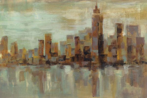 Rozmyty krajobraz miejski w ciepłych odcieniach miedzi i brązu, odbijający się w spokojnej powierzchni wody. Delikatne pociągnięcia pędzla i mgiełka światłoniebieskiego i złota tworzą wymarzony i abstrakcyjny obraz miasta z uspokajającą głębią i atmosferą.