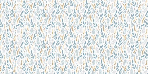 Niebieska tapeta z wzorem różnych liści. Te liście są na białym tle.