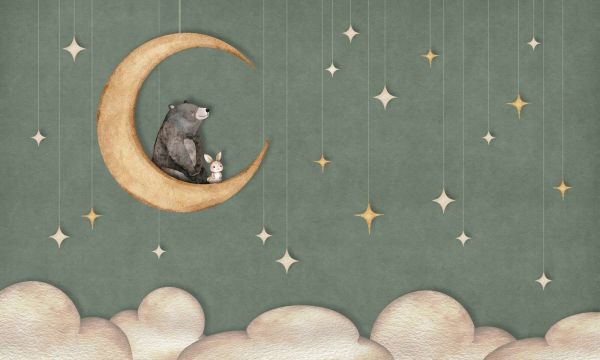 Spokojna nocna scena z miłym misiem i małym króliczkiem na ciepłym złocistym księżycu. Delikatny zielony odcień w tle i wiszące gwiazdki tworzą marzycielski, bezpieczny nastrój z subtelny‑m, figlarnym charakterem.