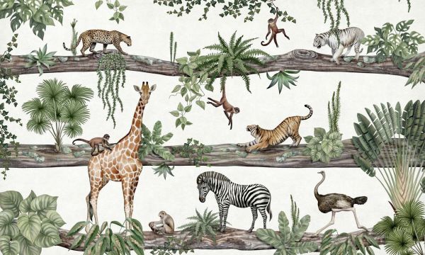 To projekt, który przywołuje magię dżungli, ożywiając piękną kolekcję dzikich zwierząt poruszających się między bujnymi liśćmi tropikalnych roślin. Na poziomych pniach drzew biegają zebry, lamparty, strusie i tygrysy, podczas gdy ciekawskie małpki bawią się między pnączami i paprociami. Wysoka żyrafa stanowi spokojne centrum, otoczone energią młodego życia. Białe tło zapewnia jasny kontrast, który dodatkowo podkreśla zieleń roślin i wzory zwierząt. Styl jest wyrafinowany i ilustracyjny, z dużym naciskiem na wyrazistość zwierząt i tekstury roślin. Paleta kolorów składa się głównie z naturalnych odcieni, takich jak oliwkowa zieleń, mchu zieleń, beż, brąz oraz subtelne akcenty okeru i szarości - co sprawia, że projekt jest zarówno uspokajający, jak i dynamiczny. Ten wzór idealnie pasuje do boho lub eklektycznego wnętrza, gdzie żywiołowość i naturalne elementy odgrywają kluczową rolę. Doskonale sprawdzi się także w pokoju dziecięcym z motywem dżungli, gdzie pobudza wyobraźnię i odkrywanie. Połącz go z drewnianymi mebelkami, koszami rattanowymi i dodatkami w ziemiście odcieniach lub motywach zwierzęcych, aby dopełnić temat. Praktyczny do zastosowania w pokojach zabaw, pokojach dziecięcych, a nawet jako atrakcyjny element w poczekalni lub przyjaznym dla dzieci lokalu gastronomicznym. Pozioma struktura sprawia, że jest wizualnie zrównoważony, a zabawny charakter zapewnia niekończącą się przyjemność z oglądania.